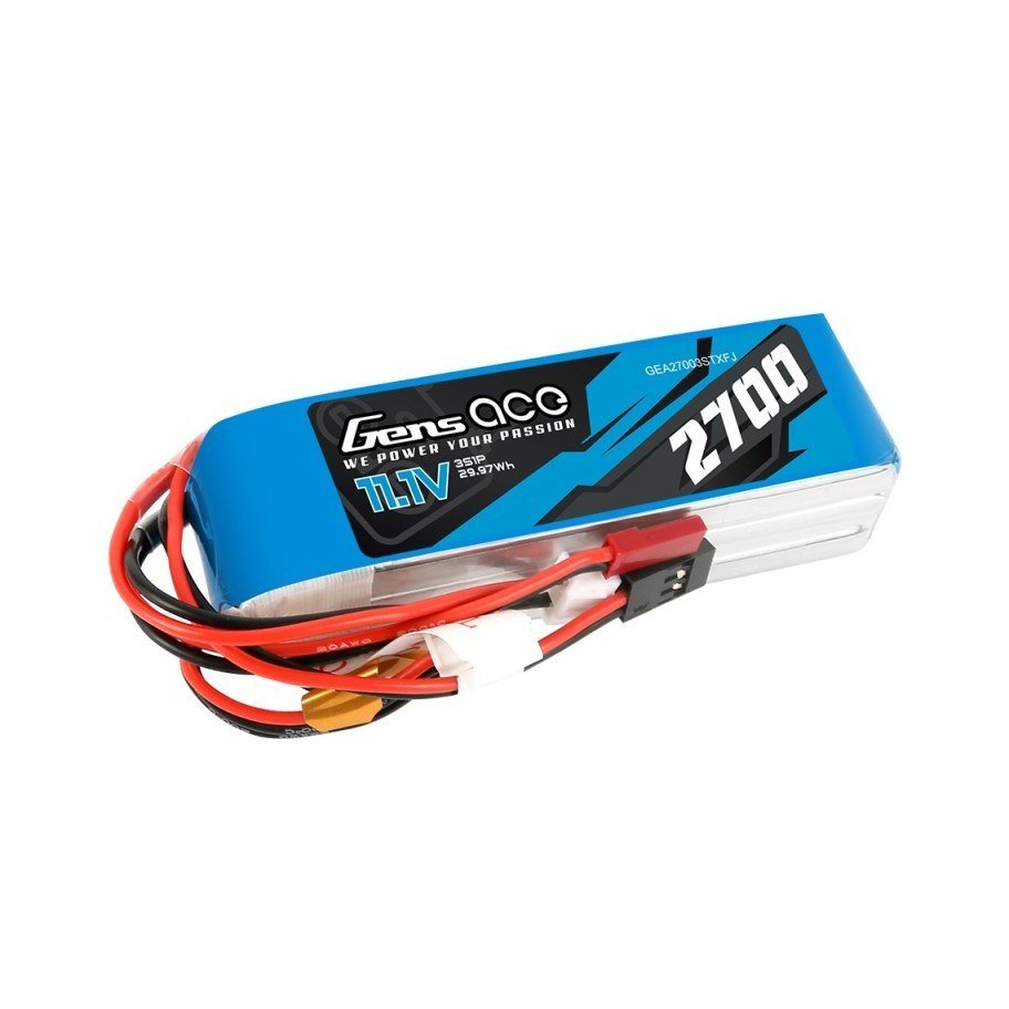 La batteria Lipo Gens ace da 2700mAh 3S1P include connettori speciali progettati specificamente per trasmettitori RC, come il popolare FrSky Taranis X9D. Dispone di connettore di bilanciamento, un connettore JST e un connettore servo standard maschio, garantendo un'ampia compatibilità con varie radio.