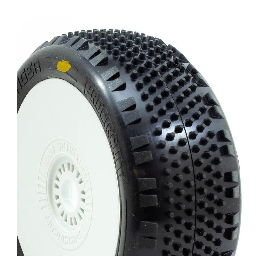 La Stinger è una ruota progettata specificamente per circuiti di moquette con alto livello di aderenza. Si distingue per il suo motivo di tasselli lunghi e distanziati al centro, combinati con blocchi angolati sui lati, che forniscono una trazione diretta e riduzione dell'eccesso di aderenza laterale ad alte velocità. Questo si traduce in un passaggio in curva più pulito e controllato, ideale per il treno anteriore o per configurazioni che privilegiano la facilità di guida.